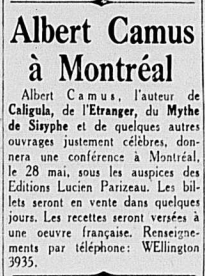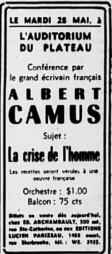 28. Montréal. Conférence à l’Auditorium du Plateau. La conférence, prévue sous l’instigation de l’éditeur canadien Lucien Parizeau, est annulée, du fait de menaces reçues et par peur d’un chahut mémorable. Camus est très déçu, lui qui explique : « J’aime bien la bagarre. » Les pétainistes de Montréal sont les responsables de ces menaces.